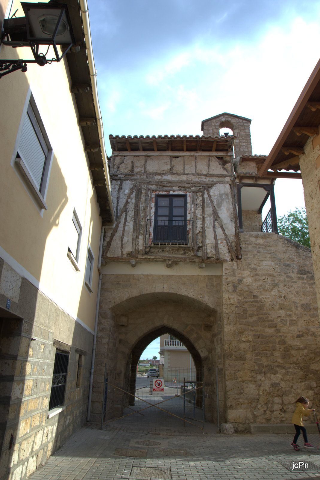 La parte correspondiente al nivel superior de la fachada norte del edificio que nos ocupa esta constituida por un entramado de madera, con entrepaños de tapial, mampuesto y adobe. Se apoya en unas cortas ménsulas de madera dispuestas en voladizo sobre la fábrica de sillería del nivel inferior del edificio, sobre el arco rebajado.