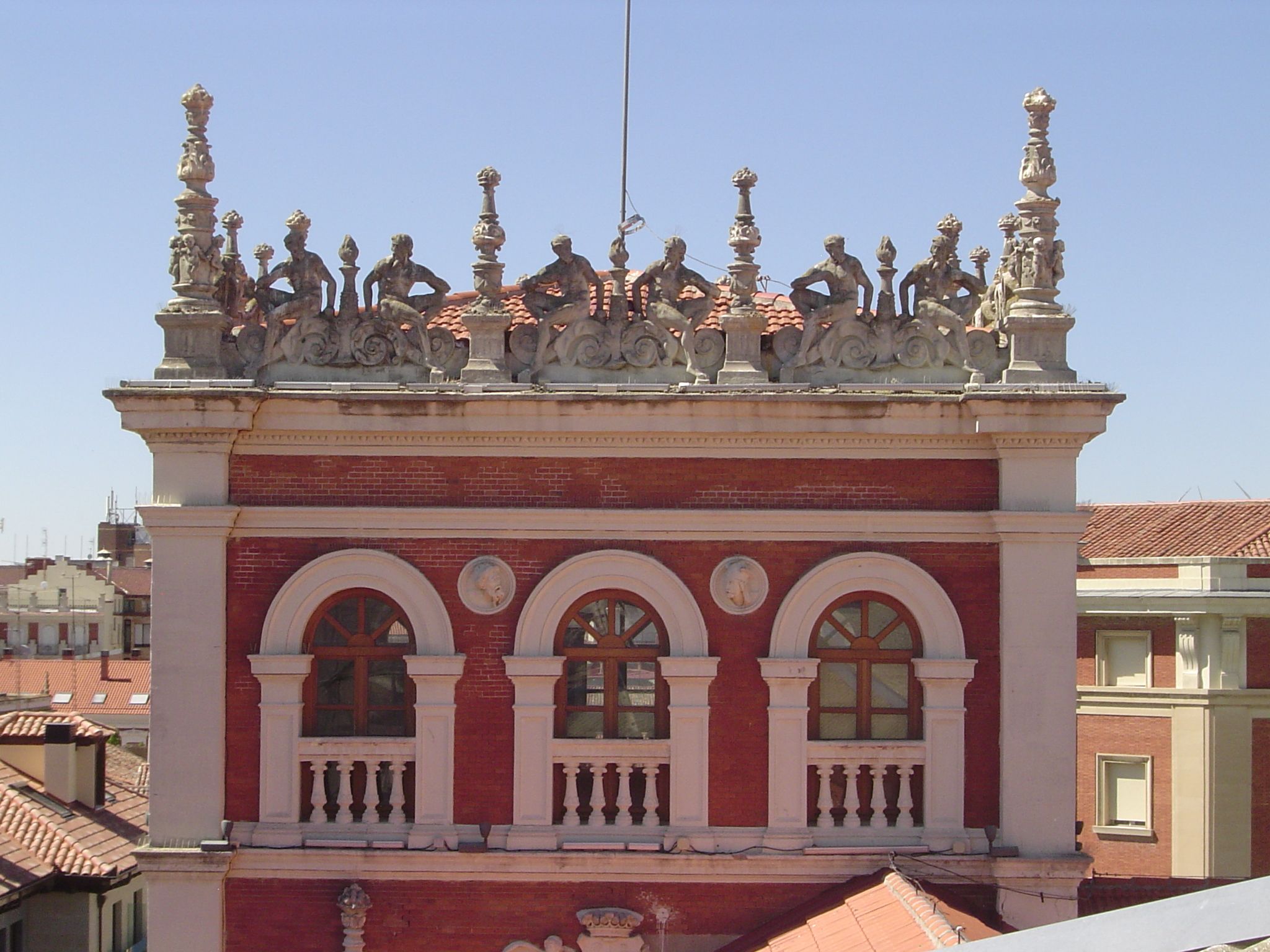 Por último en la cornisa destaca un elegante grupo escultórico central que representa a dos palentinos arropados por la alegoría a Palencia que los protege y sostiene un escudo de la provincia. Destacan también los dos pináculos que se hallan en los extremos de la pared. De esta pared de piedra salen dos pasillos de ladrillo decorados con piedra artificial en los alféizares y jambas de los ventanales y en los bordes de la cornisa (que también dispone de pináculos), estos pasillos finalizan en dos torres de unos 15 metros de altura decoradas como los pasillos y rematadas en su parte alta por esbeltos pináculos. Estas torres se unen mediante dos pasillos que confluyen en una tercera torre creando así en el interior un amplio patio. Las ventanas que dan a este patio ocupan prácticamente la totalidad del muro permitiendo una gran iluminación en el interior y dotando al patio de gran barroquismo.