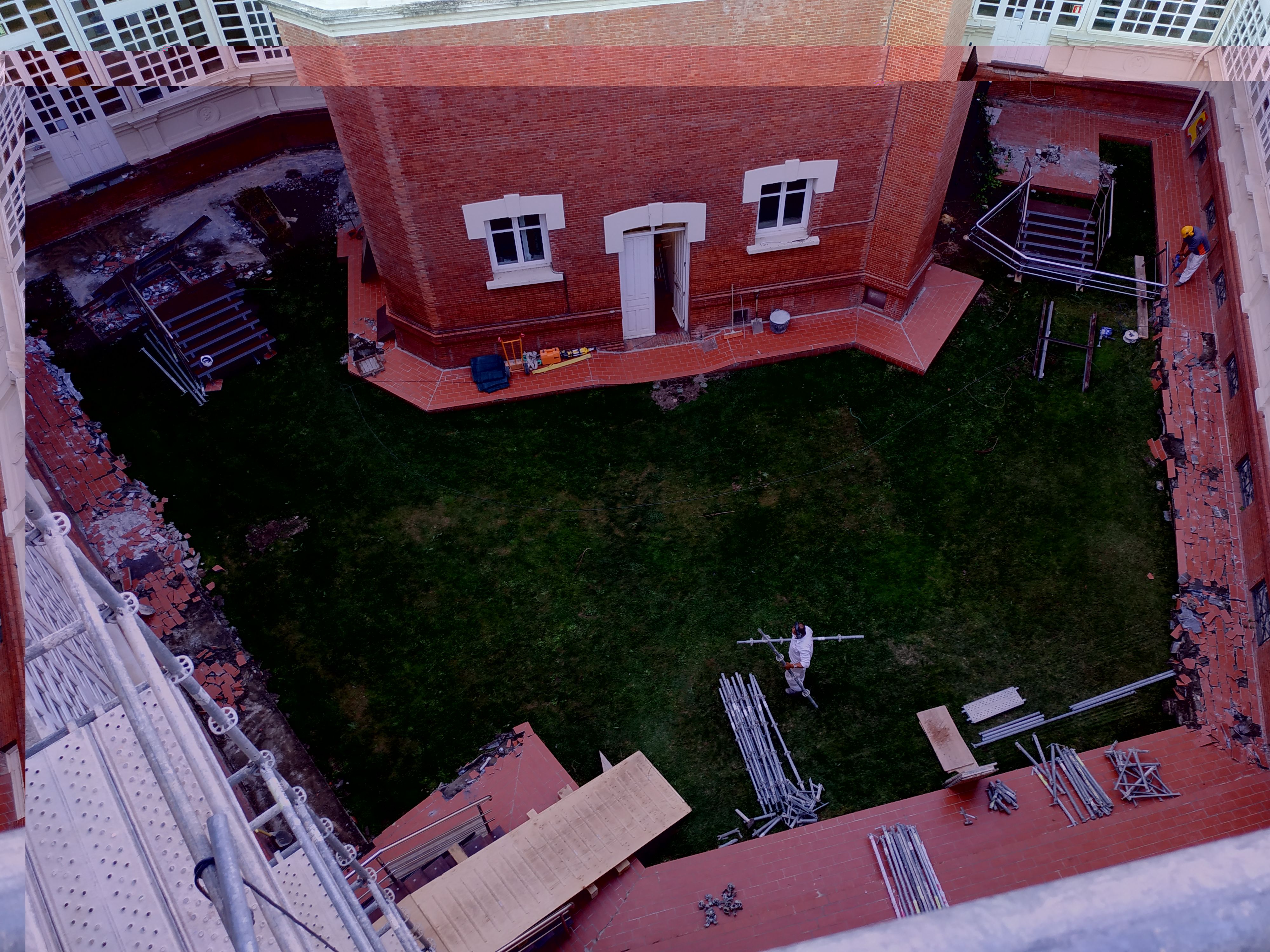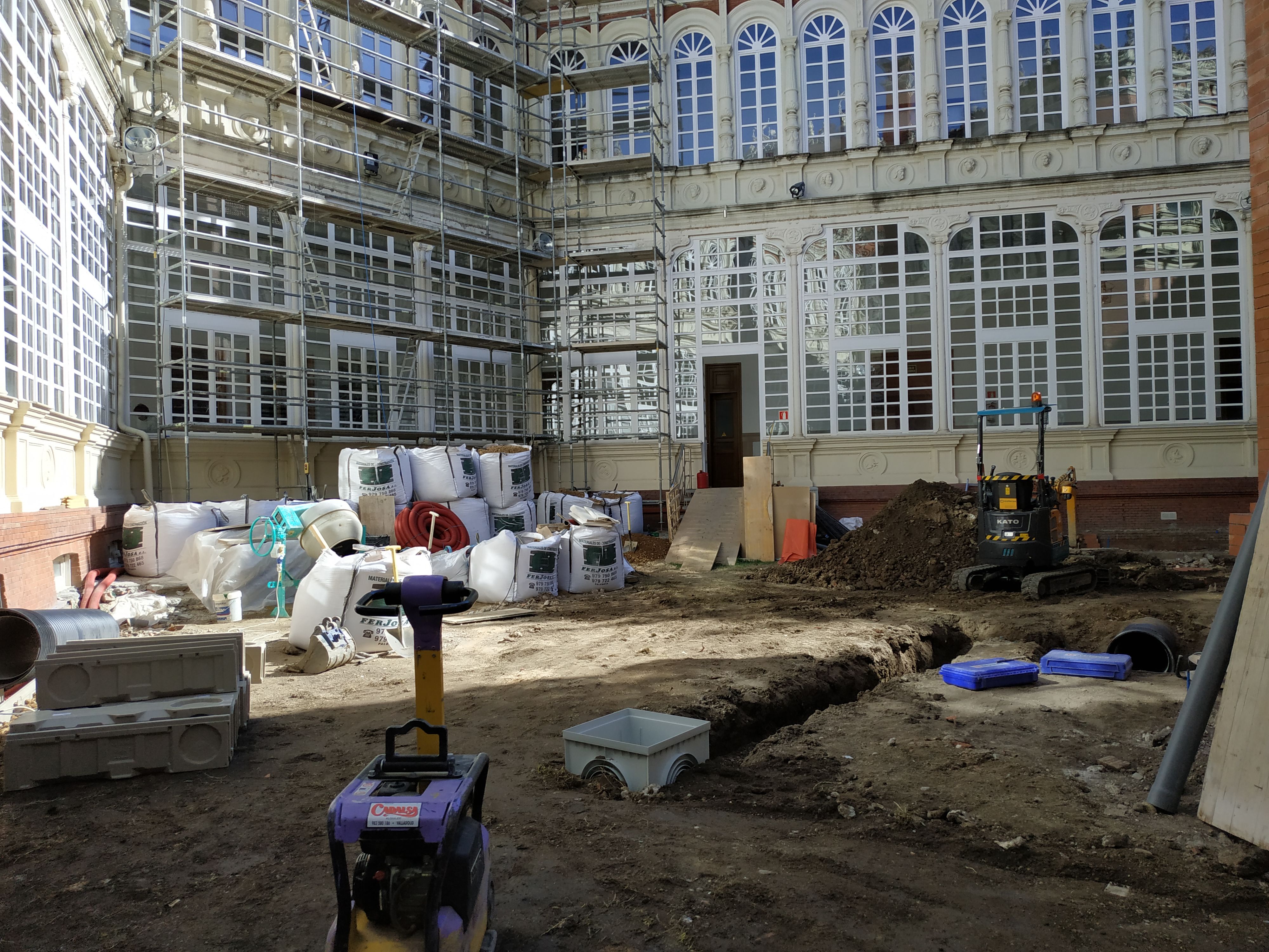 El patio del palacio presentaba numerosos problemas de diversa índole (funcionales, de estanqueidad, de seguridad…), por lo que se ha llevado a cabo la renovación de la red de saneamiento, la pavimentación y la restauración de sus elementos de fachada, para subsanar estas deficiencias.