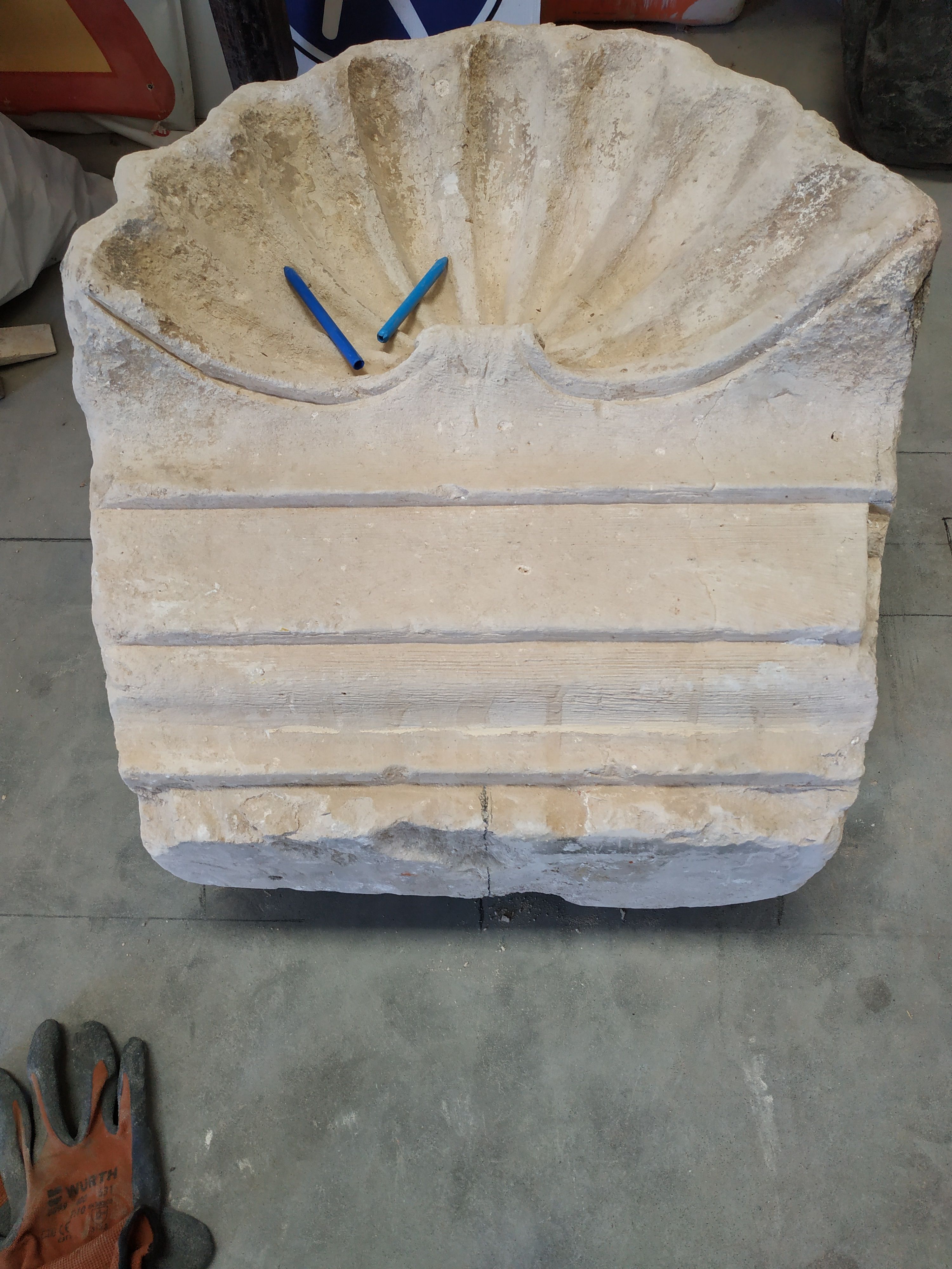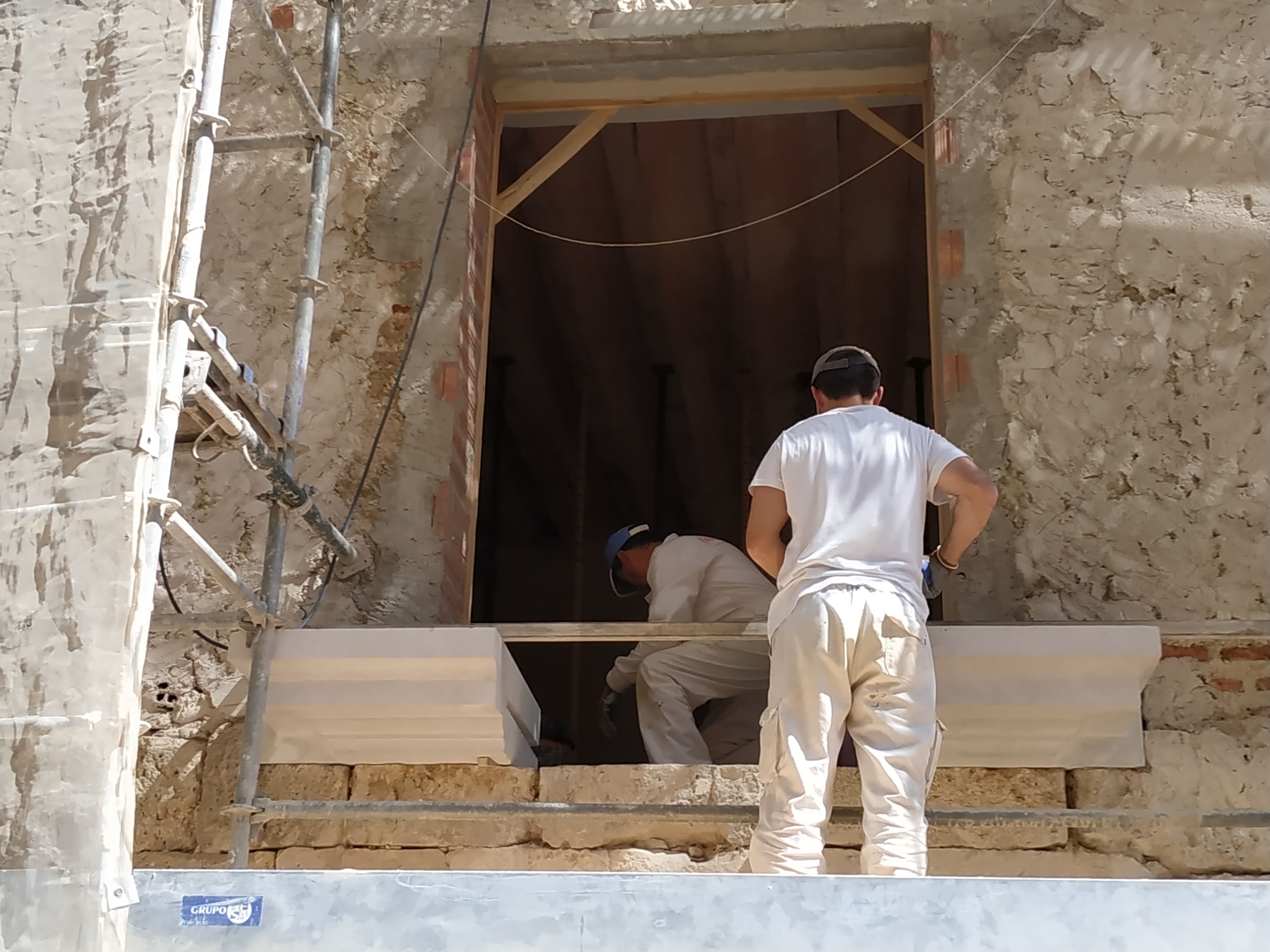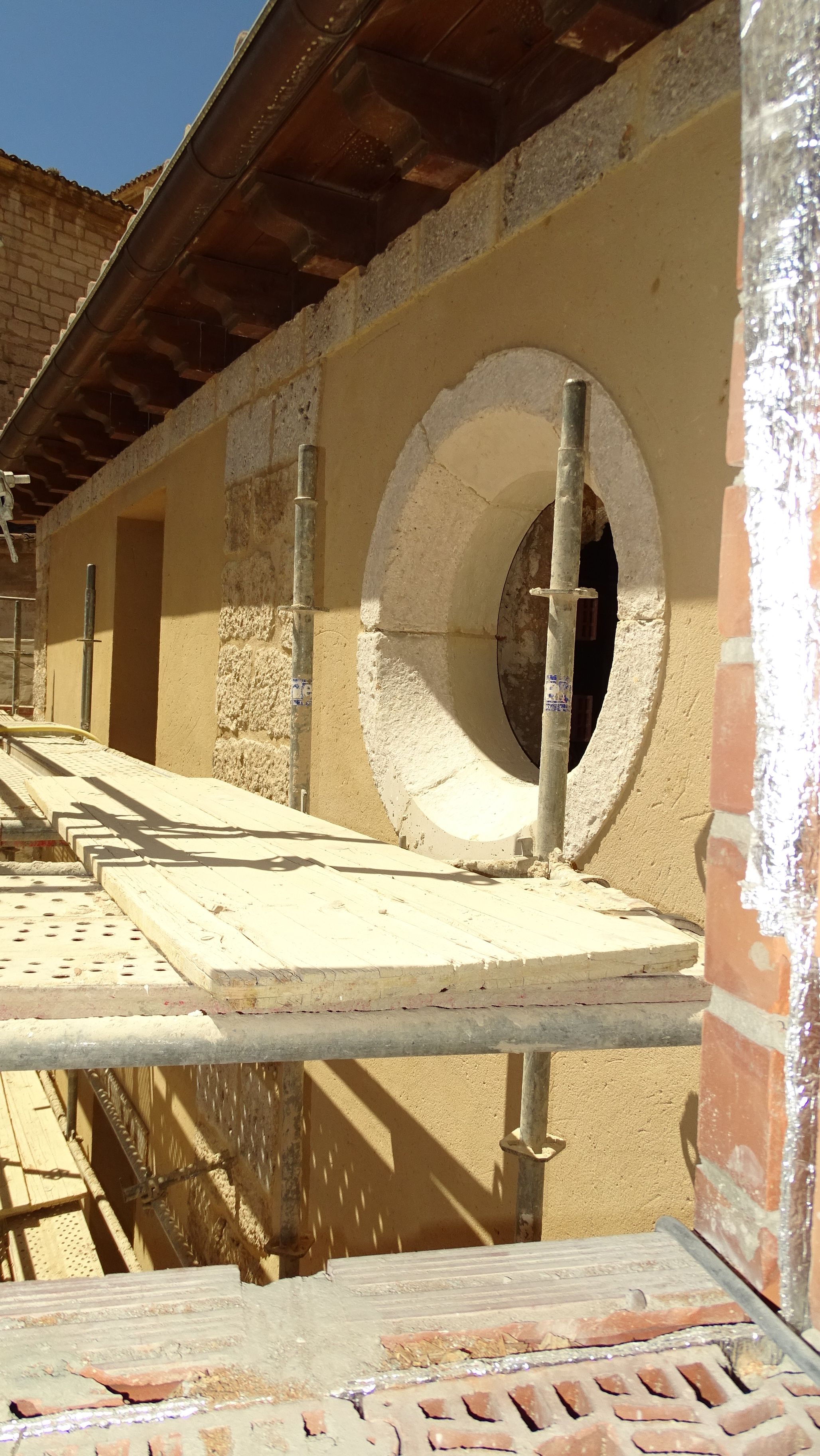 Tallado y colocación de un óculo circula de piedra, así como el receracado y poyo de un balcón de la fachada principal. Ejecutado en taller y acabado y colocación en obra, para la Casa Napoleón en Dueñas.